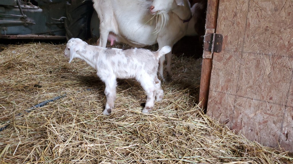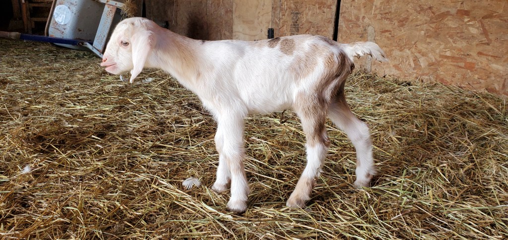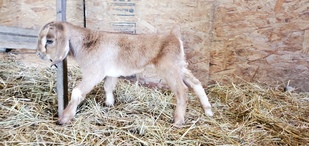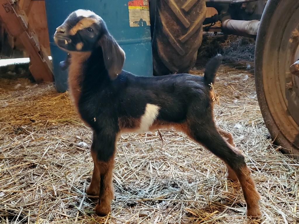 Bezoar with blaze face, belt, random white. Fantastic udders, texture, teats, temperament. You can’t go wrong adding this boy to your herd!