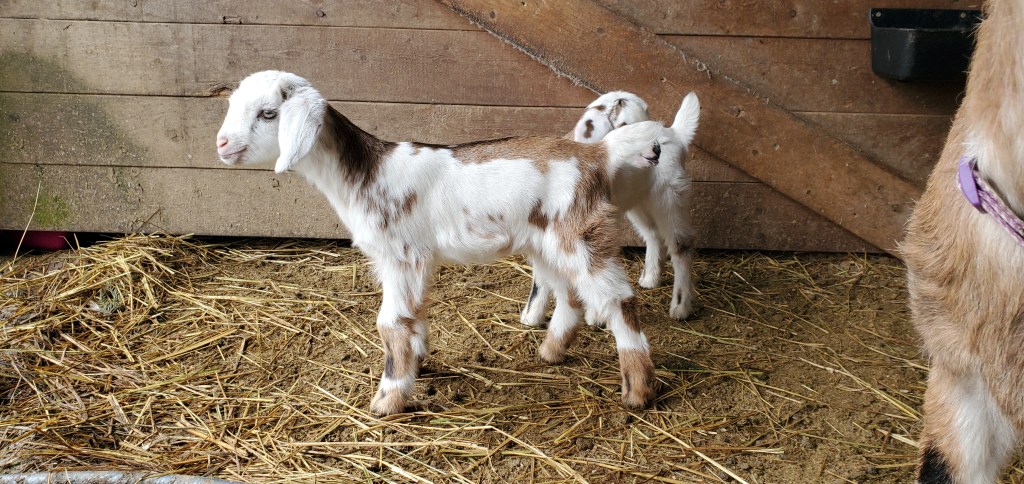 Bezoar, blaze face, frosted ears, belted, and moonspots. Possibly carries chocolate. Sire has phenomenal milk and show ancestry, dam has taken Best Udder in Show and one of our favorites on the farm.