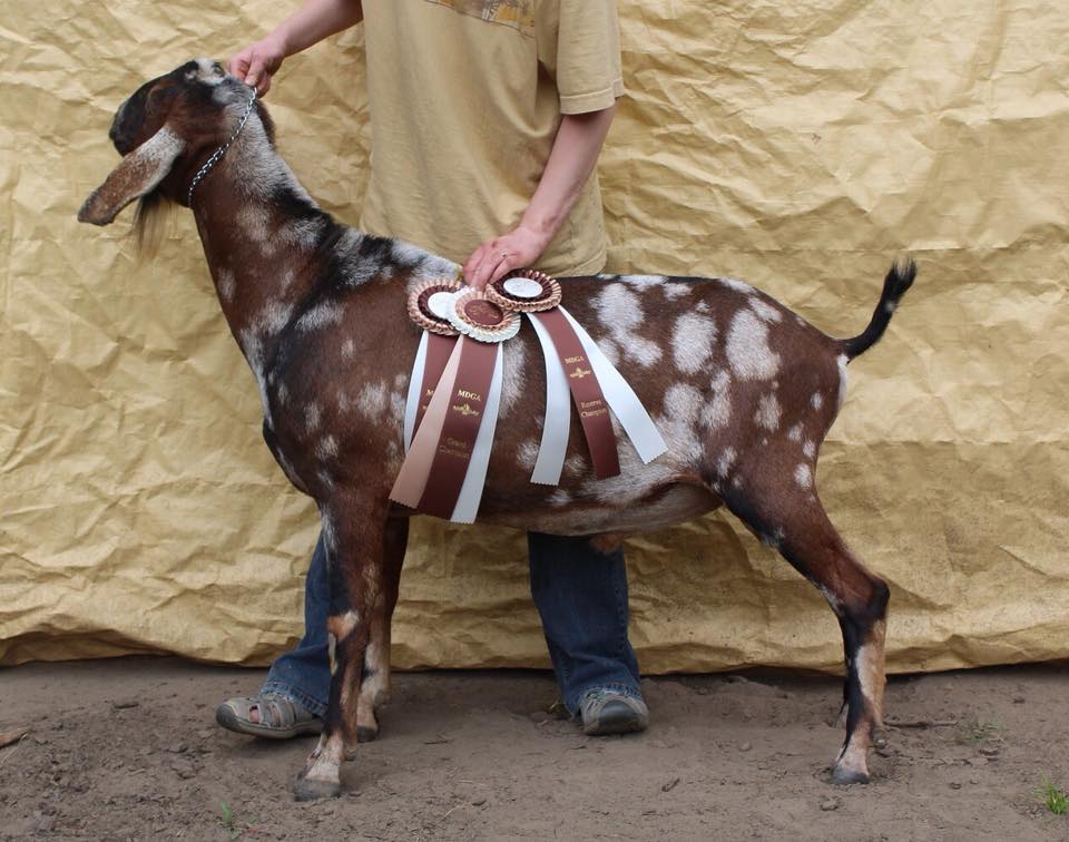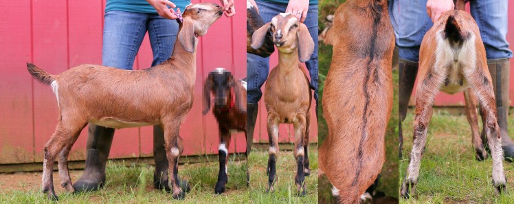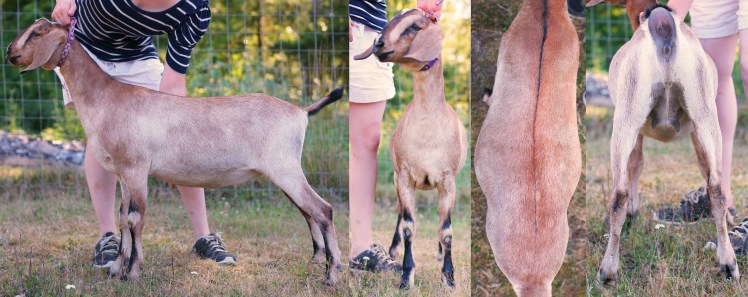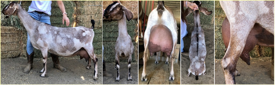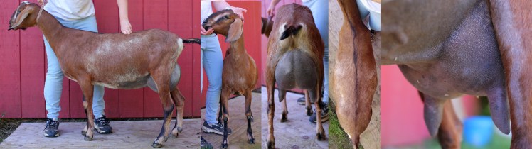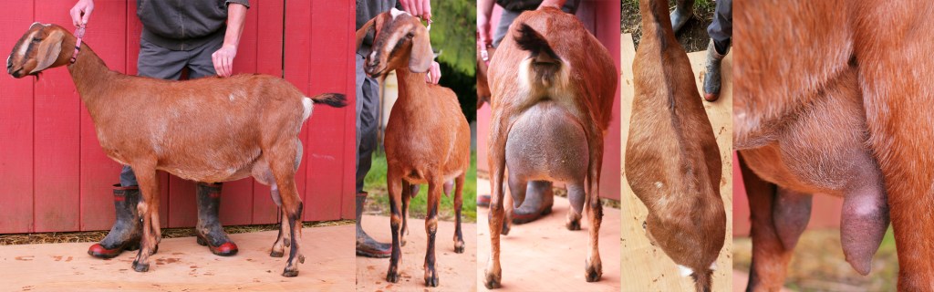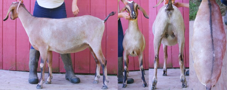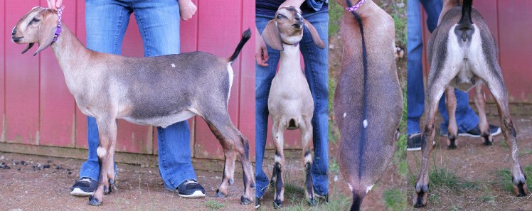 “Six over seven for the advantages of body capacity she is a longer wider and more developed doe. She is longer and more level on the top line more nearly level from hips to pins and more angular throughout.”