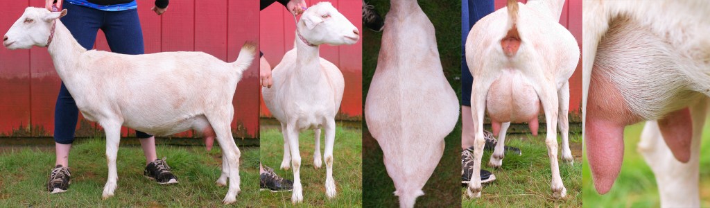 “This is a nice class of 2 yr old Mini Nubian milkers. One standing out over the others in Mammary system and will be placed First is Entry A over the class for her overall balance of 1/3 in front 1/3 behind the leg, a high wide arched-shaped escutcheon, excellent placement & clearly delineated teats, teat size in proportion to udder & capacity smooth attachments all around.”
