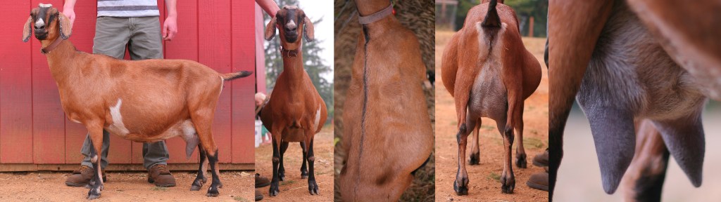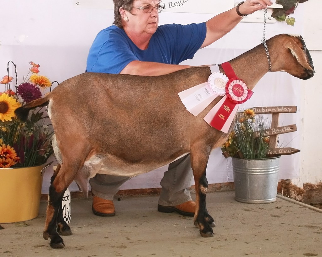 “A single entry in the aged doe class of Mini Nubians. This doe could have stood some competition. She has a very nice topline and is smoothly blended from her neck into her withers. She is sharp, angular, and open ribbed. Her mammary is still well supported and she has good height to the rear udder. We would like to see her show more capacity to the udder, but a lovely example of a 5th freshening doe.”